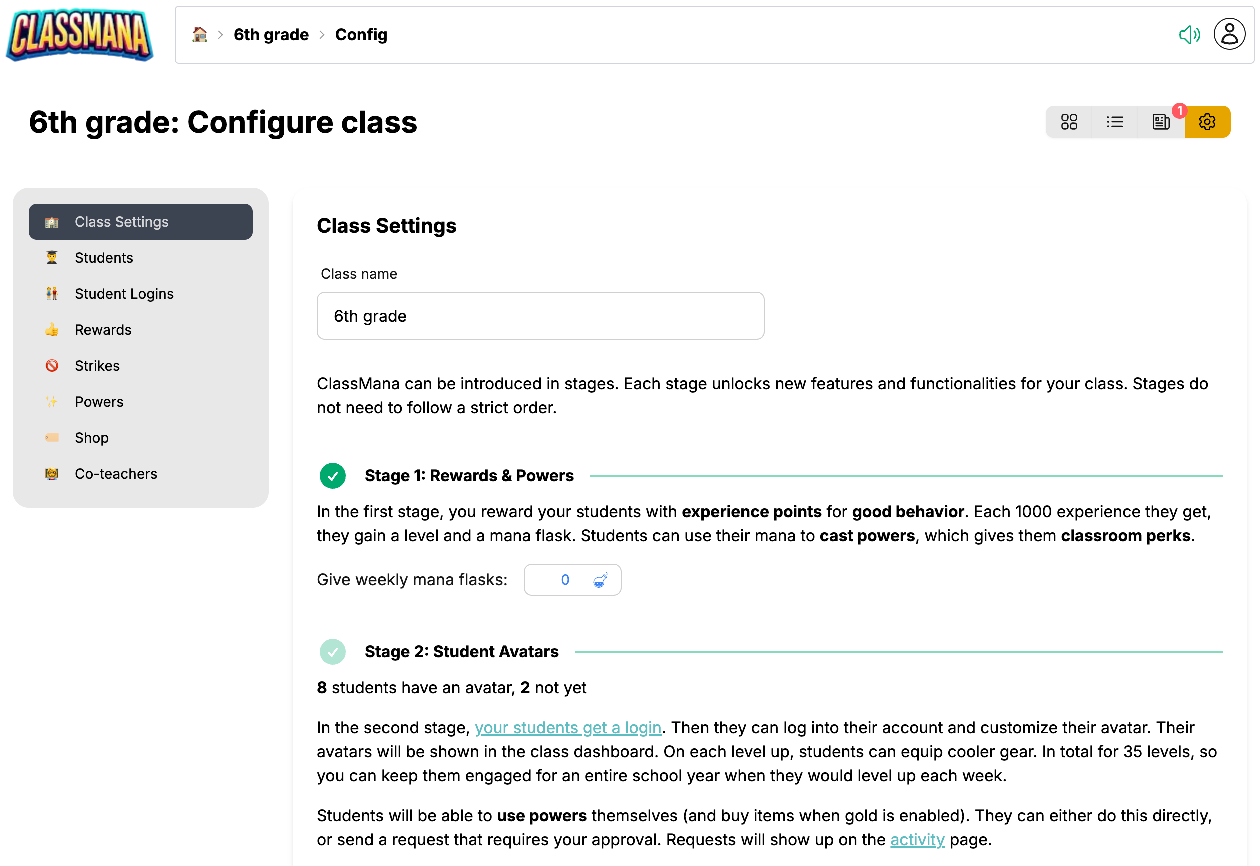 Wanneer studenten inloggen, kunnen ze krachten gebruiken en winkel items kopen direct vanaf hun avatar dashboard. Jij beslist of ze items onmiddellijk kunnen gebruiken of eerst jouw goedkeuring nodig hebben.